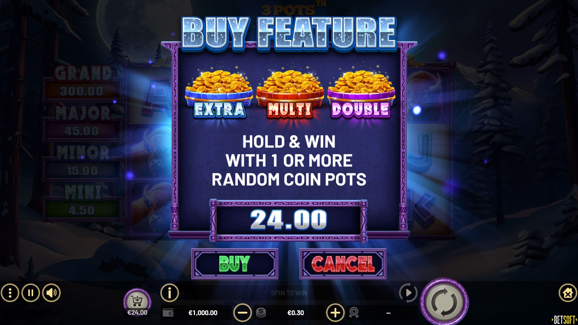 The game features 3 potent COIN POTS – EXTRA, MULTI, and DOUBLE, that collect corresponding COIN POT BONUS symbols. At any moment, one or more COIN POTS can be triggered, instantly unlocking the powerful HOLD & WIN FEATURE. Each pot applies its unique edge to the game, delivering pulse‑pounding action and rich returns.