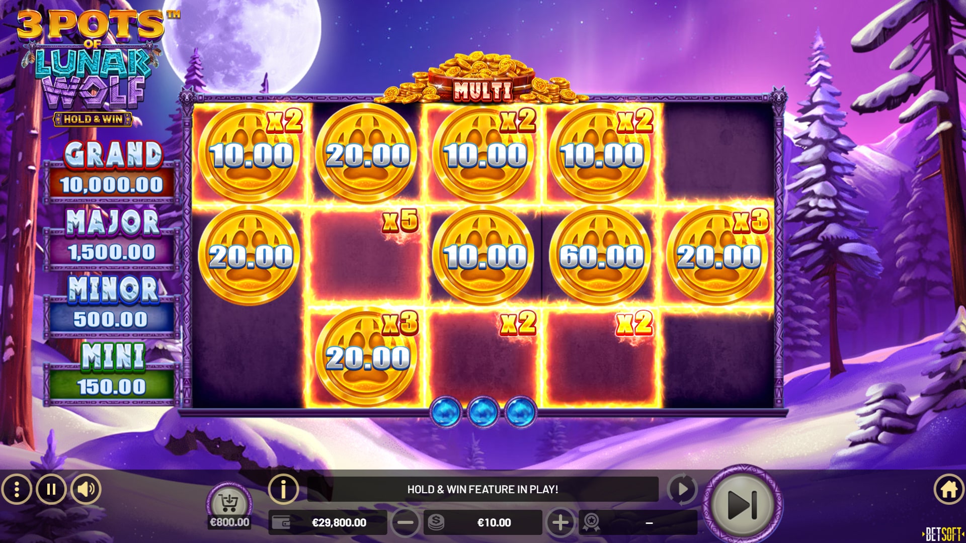 Answer the call of the wild in 3 POTS OF LUNAR WOLF – HOLD & WIN™, the latest slot adventure by Betsoft. Cold air bites as a wolf’s howl signals the chase for untamed rewards.