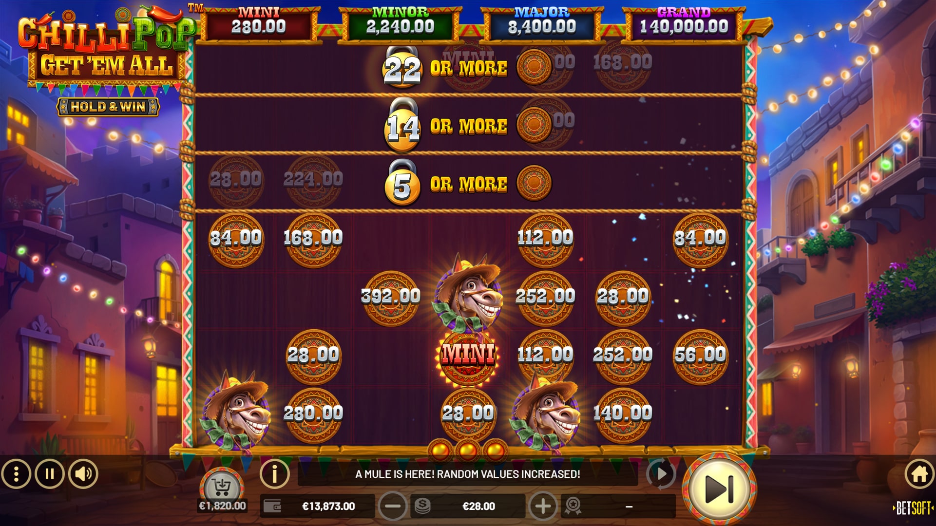 Satisfy your spicy cravings with CHILLIPOP: GET EM ALL – HOLD & WIN™! This innovative sequel to the fanbeloved CHILLIPOP™ starts with a 5×4 grid of your favorite salsa vegetables, which can unlock to a final size of 7×7 during the HOLD & WIN FEATURE, offering plenty of chances to win big!