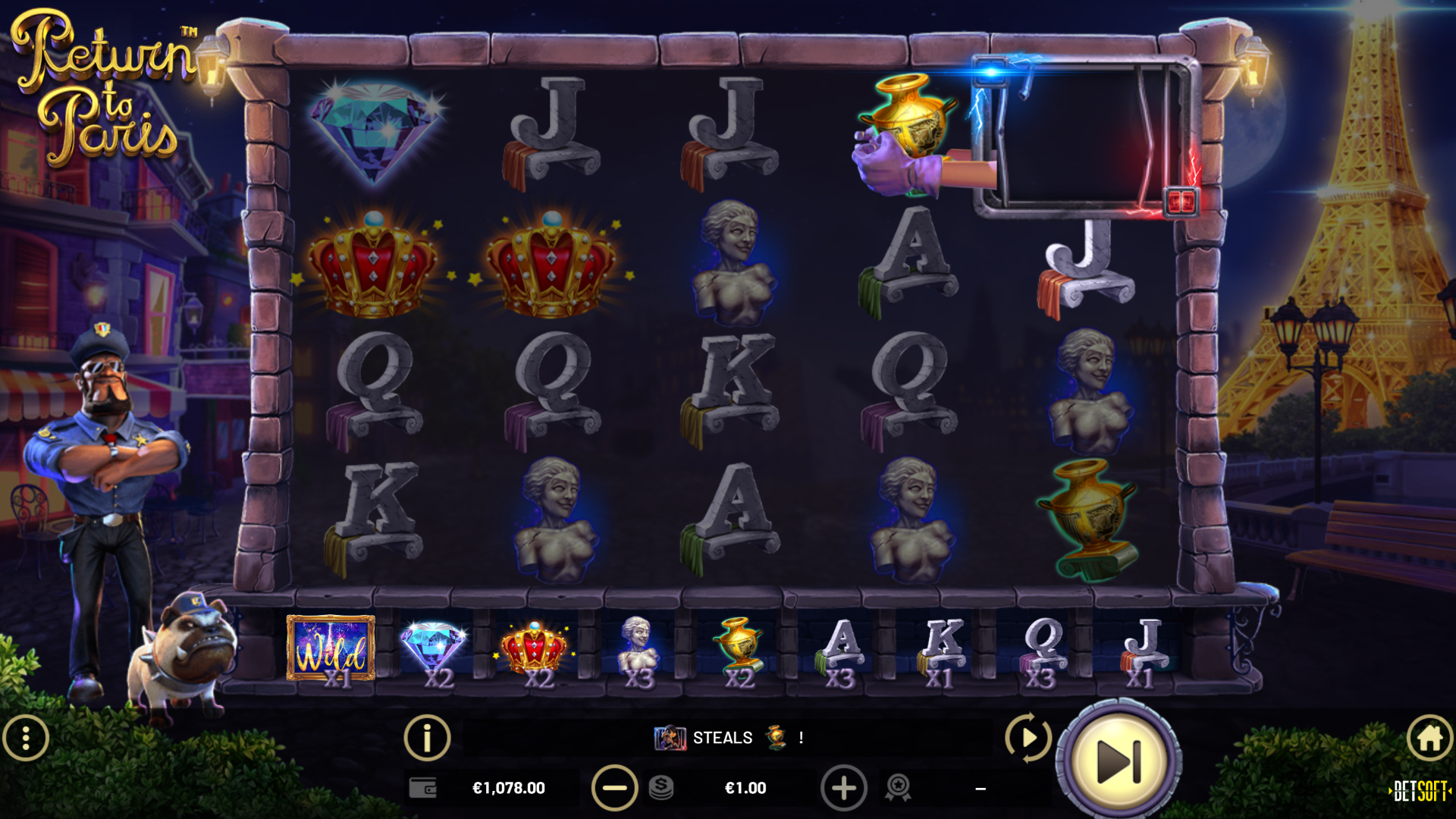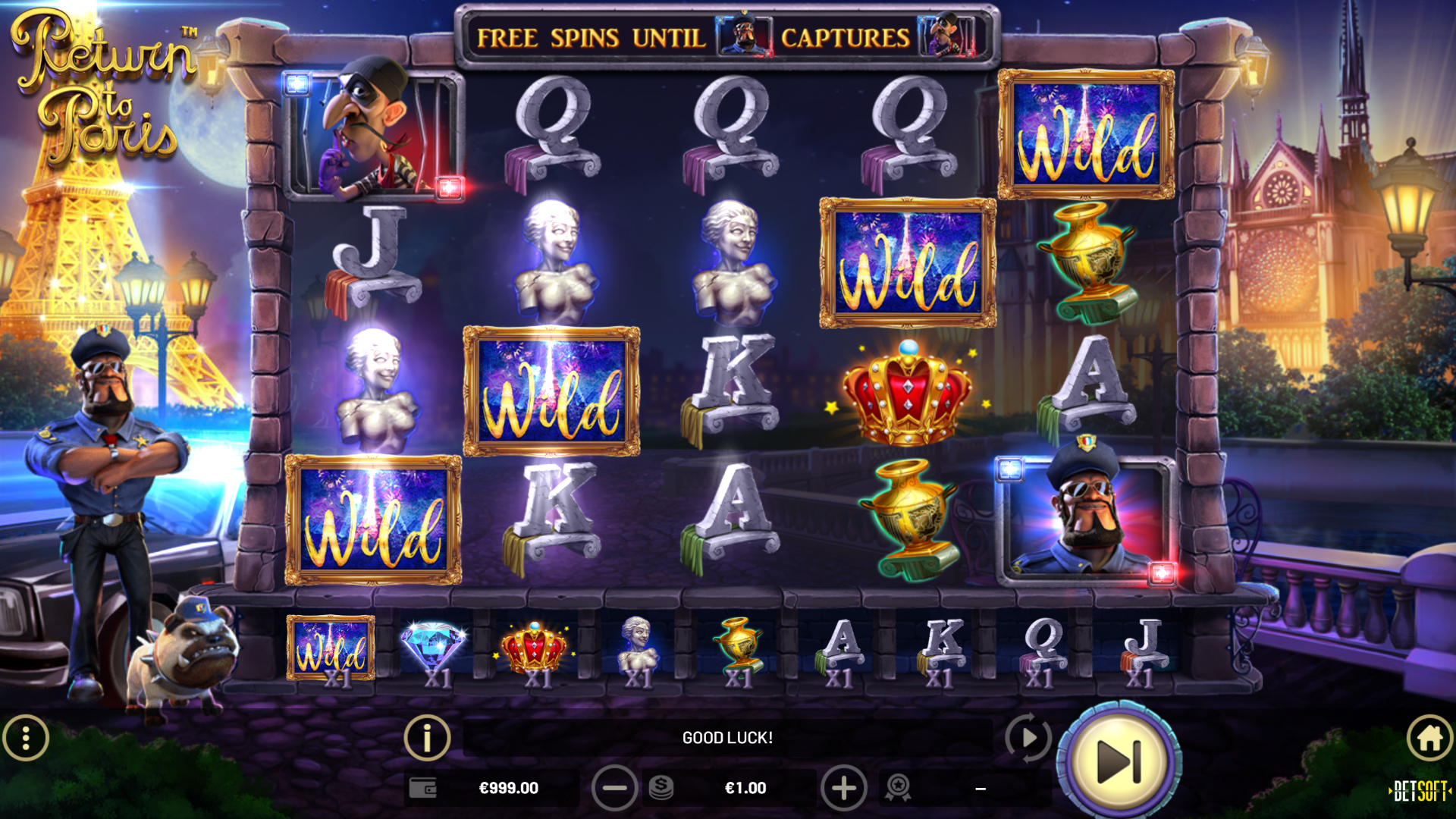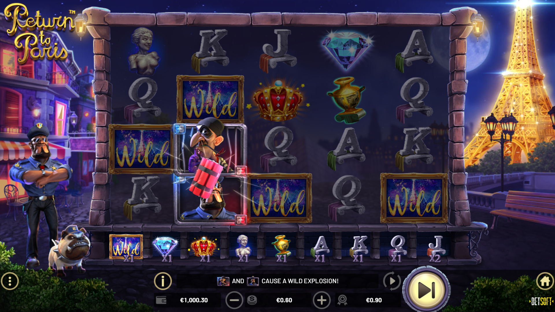 When the Thief and the Cop land adjacently on the reels, a Wild Explosion is triggered, turning all surrounding symbols to WILDS!
