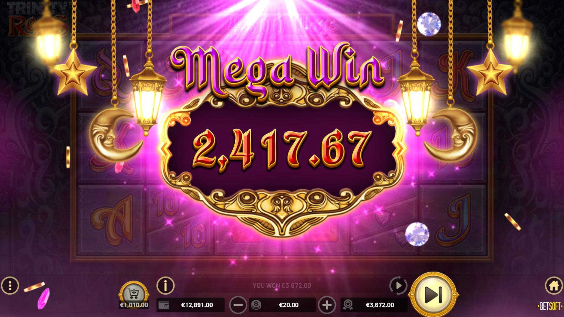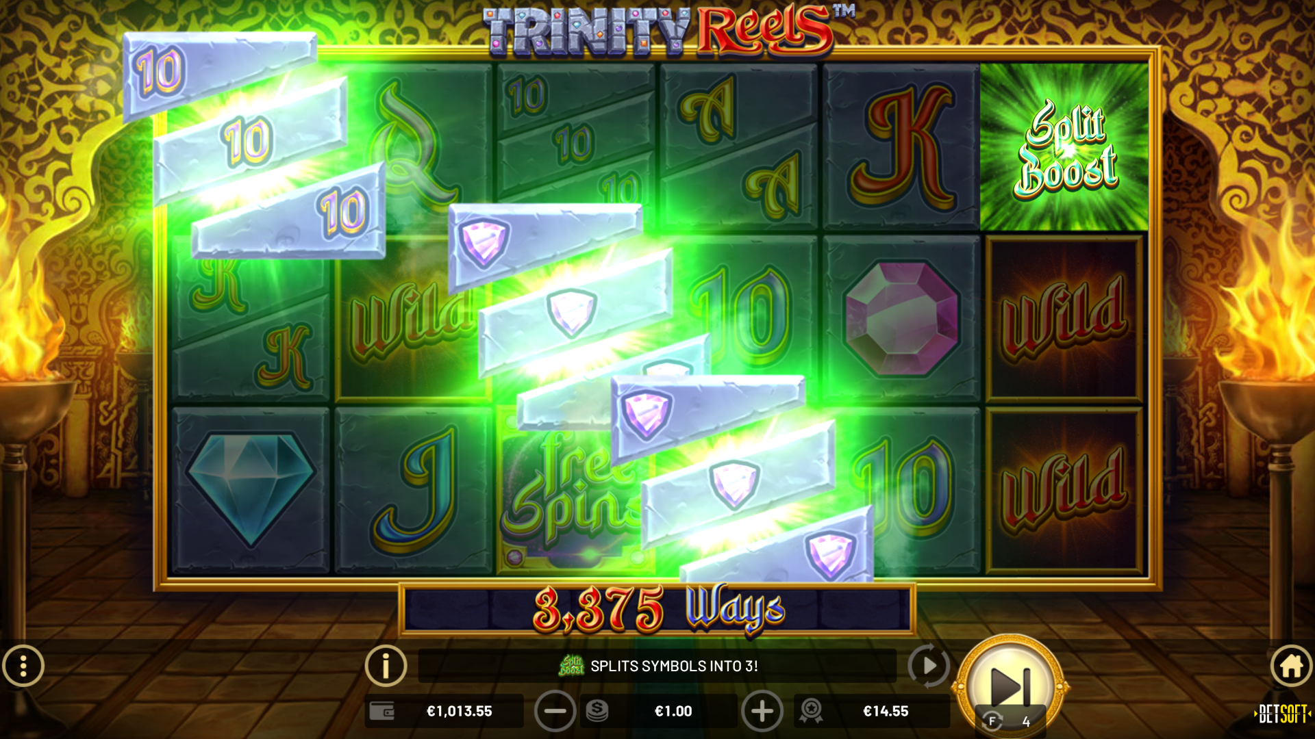 The first 5 reels can display these split symbols, while the sixth reel is reserved for single symbols and the Sixth Reel Special BOOSTS that each enhance TRINITY REELS™ gameplay in different and powerful ways. The WILD BOOST will spawn 1-2 TRIPLE WILD symbols on reels 2-5, while the SPLIT BOOST chooses 2 or 3 positions on reels 1-5 to split into double or triple symbols. And the MULTI BOOST will award a randomly chosen multiplier of 2x, 3x, 5x, or 10x to apply to any wins! Best of all, more than 1 special BOOST can land on the reels at the same time!