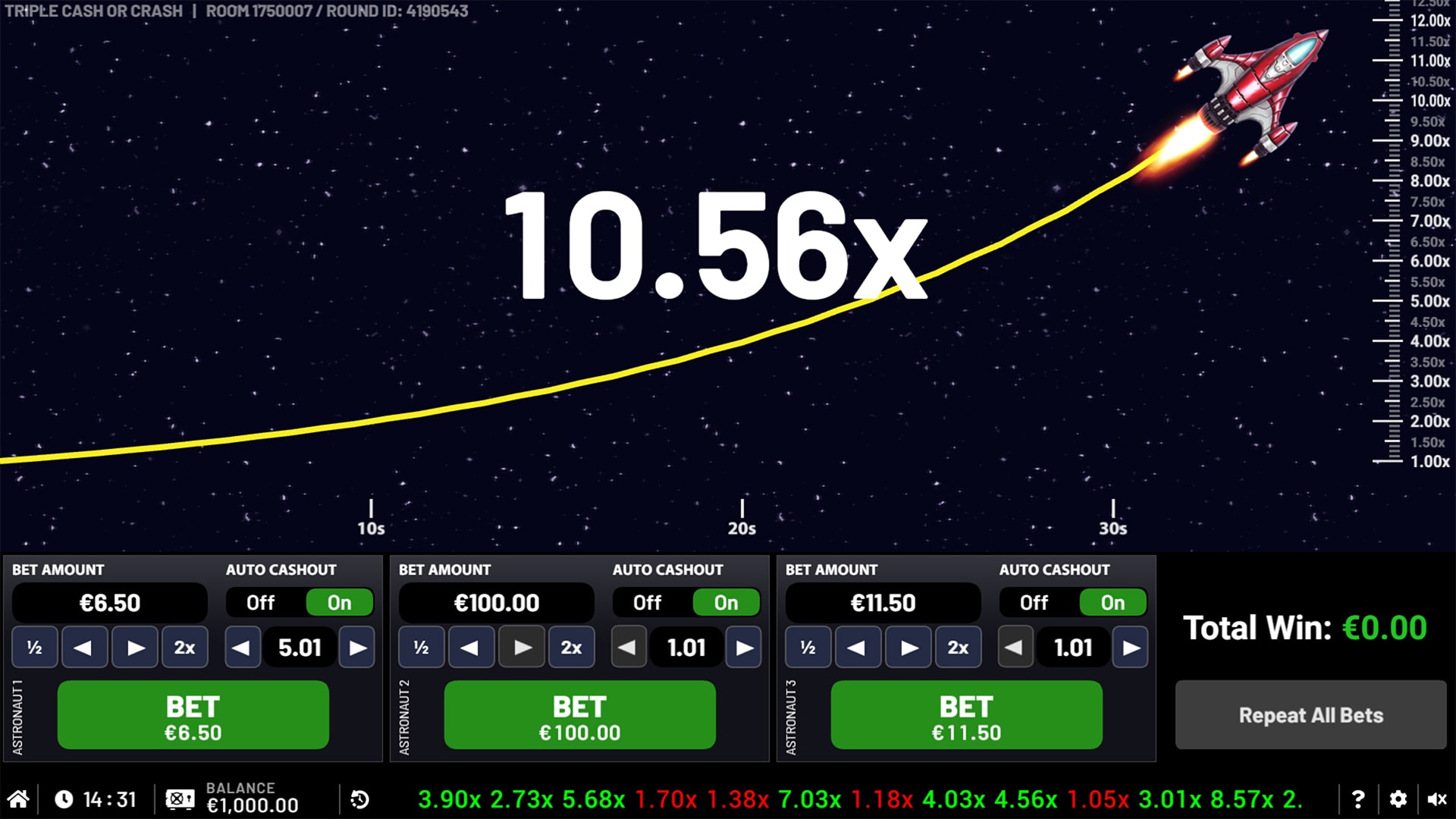 Press the CASH OUT button next to the astronauts to eject them before the rocket explodes to claim your win! How high will your multiplier climb? You can also set the game to automatically cash out when a certain multiplier is reached.